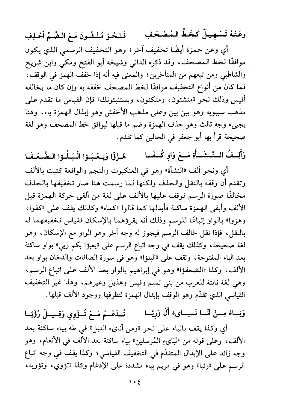 أي وكذا يقف بالياء على نحو «ومن آناىء الليل» في طه بياء ساكنة بعد الألف، وعلى قوله من «نباىء المرسلين» بياء ساكنة بعد الألف في الأنعام، وهو وجه زائد على الإبدال المتقدّم في التخفيف القياسي؛ وكذا يقف في وجه اتباع الرسم على «رئيا» وهو في مريم بياء مشددة على الإدغام وكذا «تؤوي، وتؤويه،