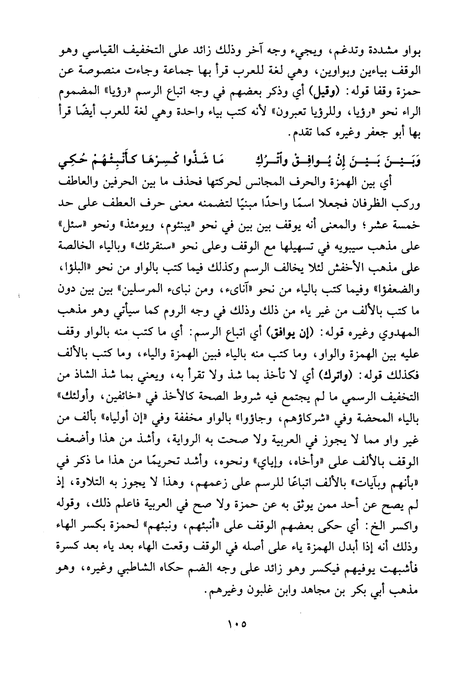 بواو مشددة وتدغم، ويجيء وجه آخر وذلك زائد على التخفيف القياسي وهو الوقف بياءين وبواوين، وهي لغة للعرب قرأ بها جماعة وجاءت منصوصة عن حمزة وقفا قوله: (وقيل) أي وذكر بعضهم في وجه اتباع الرسم «رؤيا» المضموم الراء نحو «رؤيا، وللرؤيا تعبرون» لأنه كتب بياء واحدة وهي لغة للعرب أيضا قرأ بها أبو جعفر وغيره كما تقدم.