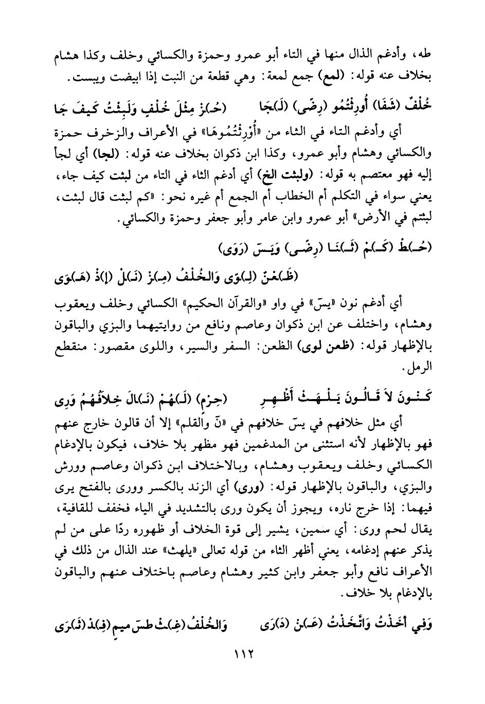 أي وأدغم التاء في الثاء من «أورثتموها» في الأعراف والزخرف حمزة والكسائي وهشام وأبو عمرو، وكذا ابن ذكوان بخلاف عنه قوله: (لجا) أي لجأ إليه فهو معتصم به قوله: (ولبثت الخ) أي أدغم الثاء في التاء من لبثت كيف جاء، يعني سواء في التكلم أم الخطاب أم الجمع أم غيره نحو: «كم لبثت قال لبثت، لبثتم في الأرض» أبو عمرو وابن عامر وأبو جعفر وحمزة والكسائي.