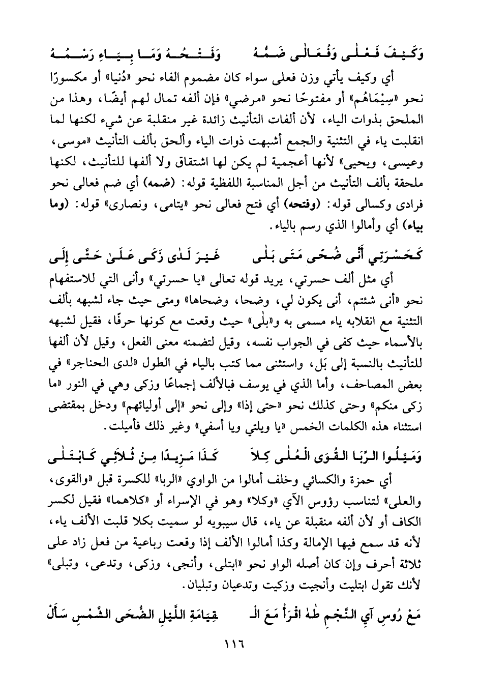 أي مثل ألف حسرتي، يريد قوله تعالى «يا حسرتي» وأنى التي للاستفهام نحو «أنى شئتم، أنى يكون لي، وضحا، وضحاها» ومتى حيث جاء لشبهه بألف التثنية مع انقلابه ياء مسمى به و «بلى» حيث وقعت مع كونها حرفا، فقيل لشبهه بالأسماء حيث كفى في الجواب نفسه، وقيل لتضمنه معنى الفعل، وقيل لأن ألفها للتأنيث بالنسبة إلى بل، واستثنى مما كتب بالياء في الطول «لدى الحناجر» في بعض المصاحف، وأما الذي في يوسف فبالألف إجماعا وزكى وهي في النور «ما زكى منكم» وحتى كذلك نحو «حتى إذا» وإلى نحو «إلى أوليائهم» ودخل بمقتضى استثناء هذه الكلمات الخمس «يا ويلتي ويا أسفي» وغير ذلك فأميلت.