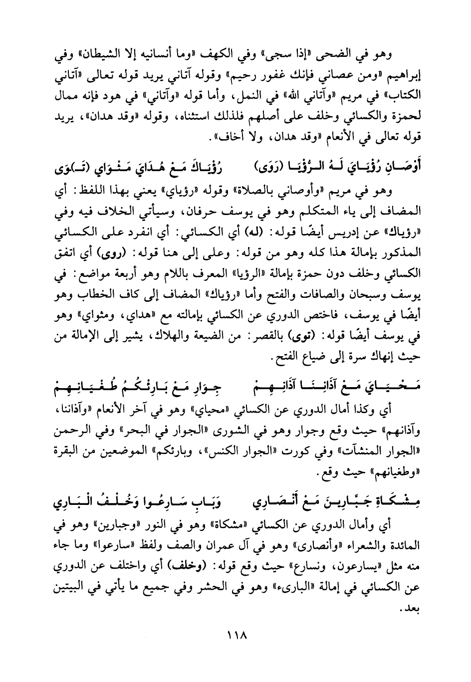 أي وكذا أمال الدوري عن الكسائي «محياي» وهو في آخر الأنعام «وآذاننا، وآذانهم» حيث وقع وجوار وهو في الشورى «الجوار في البحر» وفي الرحمن «الجوار المنشآت» وفي كورت «الجوار الكنس»، وبارئكم» الموضعين من البقرة «وطغيانهم» حيث وقع.