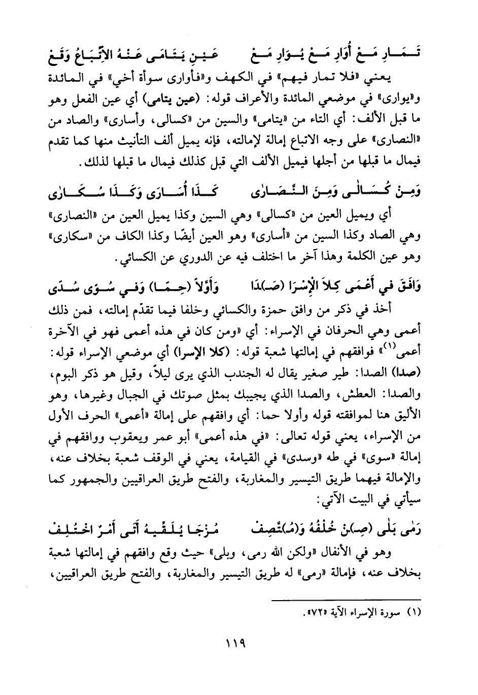 أخذ في ذكر من وافق حمزة والكسائي وخلفا فيما تقدّم إمالته، فمن ذلك أعمى وهي الحرفان في الإسراء: أي «ومن كان في هذه أعمى فهو في الآخرة أعمى (¬1)» فوافقهم في إمالتها شعبة قوله: (كلا الإسرا) أي موضعي الإسراء قوله: