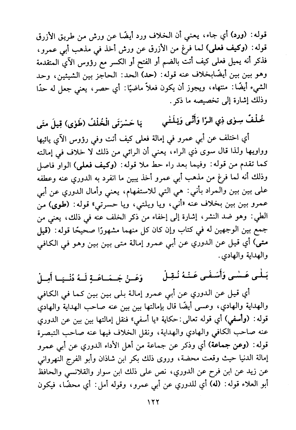 أي قيل عن الدوري عن أبي عمرو إمالة بلى بين بين كما في الكافي والهداية والهادي، وعسى أيضا قال بإمالتها بين بين عنه صاحب الهداية والهادي قوله: (وأسفي) أي قوله تعالى: حكاية «يا أسفي» فنقل إمالتها بين بين عن الدوري عنه صاحب الكافي والهادي والهداية، ونقل الخلاف فيها عنه صاحب التبصرة قوله: (وعن جماعة) أي وذكر عن جماعة من أهل الأداء الدوري عن أبي عمرو إمالة الدنيا حيث وقعت محضة، وروى ذلك بكر ابن شاذان وأبو الفرج النهرواني عن زيد عن ابن فرح عن الدوري، نص على ذلك ابن سوار والقلانسي والحافظ أبو العلاء قوله: (له) أي للدوري عن أبي عمرو، وقوله أمل: أي محضا، فيكون