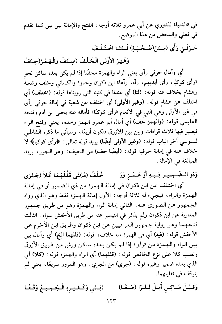 أي اختلف عن ابن ذكوان في إمالة الهمزة من ذي الضمير أو في إمالة الهمزة والراء، فيجيء له ثلاثة أوجه: الأول إمالة الهمزة فقط وهو الذي رواه الجمهور عن الصورى عنه. الثاني إمالة الراء والهمزة وهو من طريق جمهور المغاربة عن ابن ذكوان ولم يذكر في التيسير عنه من طريق الأخفش سواه. الثالث فتحهما وهو رواية جمهور العراقيين عن ابن ذكوان وطريق ابن الأخرم عن الأخفش قوله: (فيه) أي في الهمزة منه خلاف، قوله: (قللهما الخ) أي وأمال بين بين الراء والهمزة من «رأى» إذا لم يكن بعده ساكن ورش من طريق الأزرق ونصب كلا على نزع الخافض قوله: (قللهما) أي الراء والهمزة قوله: (كلا) أي الذي بعده ضمير وغيره قوله: (جرى) من الجري: وهو المرور سريعا، يعني لم يتوقف في تقليلهما.