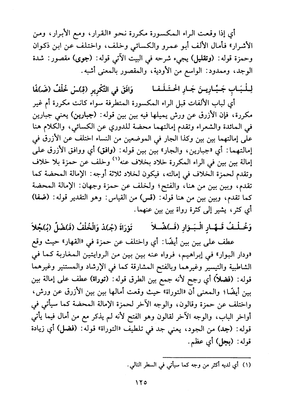 عطف على بين بين أيضا: أي واختلف عن حمزة في «القهار» حيث وقع «ودار البوار» في إبراهيم، فرواه عنه بين بين من الروايتين المغاربة كما في الشاطبية والتيسير وغيرهما وبالفتح المشارقة كما في الإرشاد والمستنير وغيرهما قوله: (فضلا) أي رجح لأنه جمع بين الطرق قوله: (توراة) عطف على إمالة بين بين أيضا؛ والمعنى أن «التوراة» حيث وقعت أمالها بين بين الأزرق عن ورش، واختلف عن حمزة وقالون، والوجه الآخر لحمزة الإمالة المحضة كما سيأتي في أواخر الباب، والوجه الآخر لقالون وهو الفتح لأنه لم يذكر مع من أمال فيما يأتي قوله: (جد) من الجود، يعني جد في تلطيف «التوراة» قوله: (فضل) أي زيادة قوله: (بجل) أي عظم.