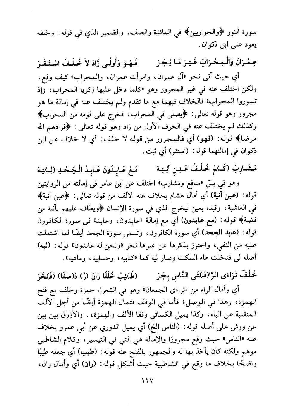 أي حيث أتى نحو «آل عمران، وامرأت عمران، والمحراب» كيف وقع، ولكن اختلف عنه في غير المجرور وهو «كلما دخل عليها زكريا المحراب، وإذ تسوروا المحراب» فالخلاف فيهما مع ما تقدم ولم يختلف عنه في إمالة ما هو مجرور وهو قوله تعالى: يصلى في المحراب، فخرج على قومه من المحراب وكذلك لم يختلف عنه في الحرف الأول من زاد وهو قوله تعالى: فزادهم الله مرضا قوله: (فهو) أي فالمجرور من قوله لا خلف: أي لا خلاف عن ابن ذكوان في إمالتهما قوله: (استقر) أي ثبت.