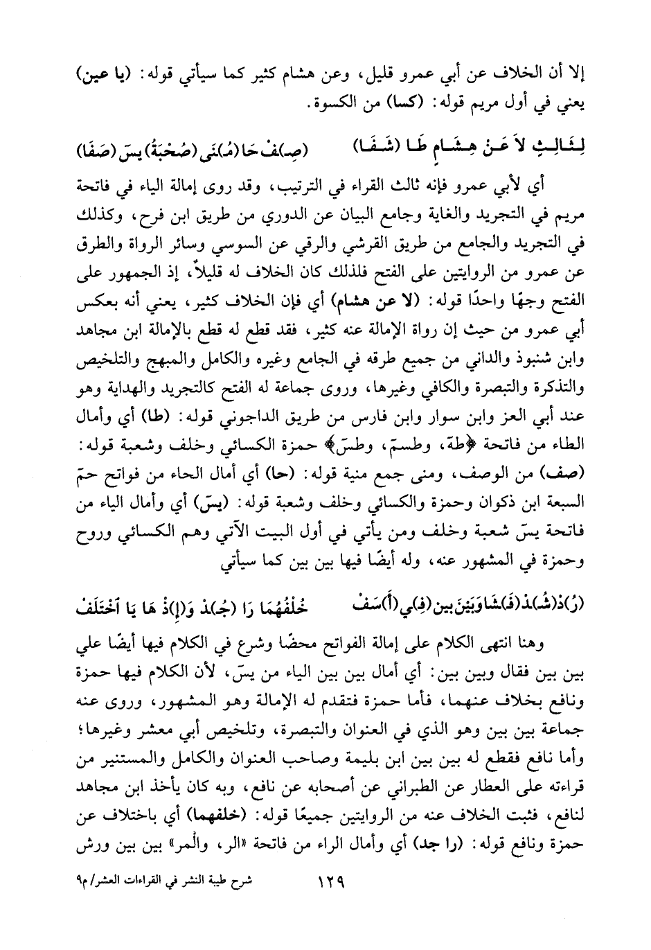 أي لأبي عمرو فإنه ثالث القراء في الترتيب، وقد روى إمالة الياء في فاتحة مريم في التجريد والغاية وجامع البيان عن الدوري من طريق ابن فرح، وكذلك في التجريد والجامع من طريق القرشي والرقي عن السوسي وسائر الرواة والطرق عن عمرو من الروايتين على الفتح فلذلك كان الخلاف له قليلا، إذ الجمهور على الفتح وجها واحدا قوله: (لا عن هشام) أي فإن الخلاف كثير، يعني أنه بعكس أبي عمرو من حيث إن رواة الإمالة عنه كثير، فقد قطع له قطع بالإمالة ابن مجاهد وابن شنبوذ والداني من جميع طرقه في الجامع وغيره والكامل والمبهج والتلخيص والتذكرة والتبصرة والكافي وغيرها، وروى جماعة له الفتح كالتجريد والهداية وهو عند أبي العز وابن سوار وابن فارس من طريق الداجوني قوله: (طا) أي وأمال الطاء من فاتحة طه، وطسم، وطس حمزة الكسائي وخلف وشعبة قوله: