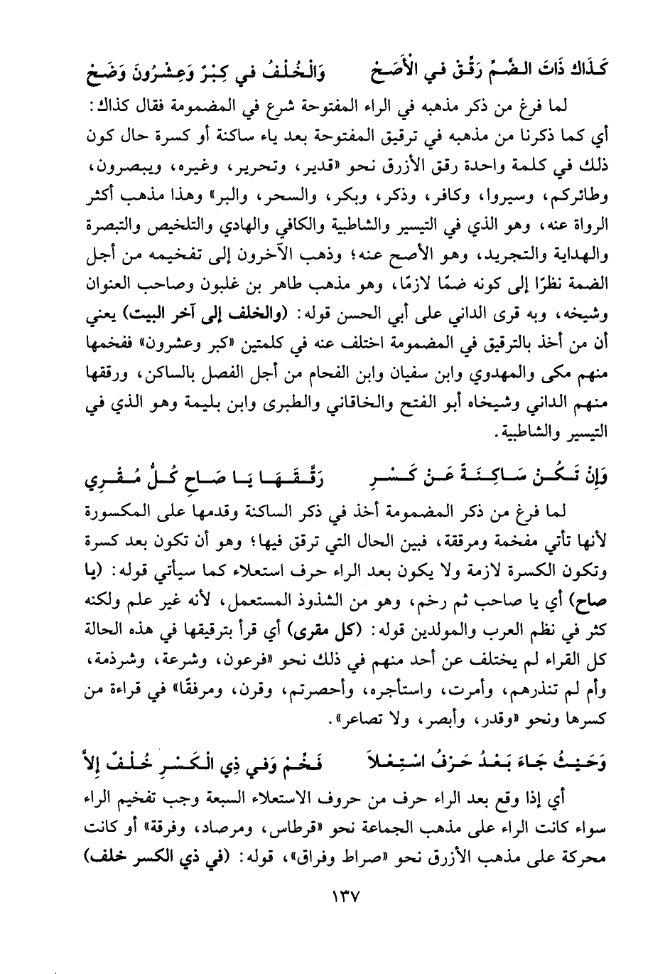 لما فرغ من ذكر المضمومة أخذ في ذكر الساكنة وقدمها على المكسورة لأنها تأتي مفخمة ومرققة، فبين الحال التي ترقق فيها؛ وهو أن تكون بعد كسرة وتكون الكسرة لازمة ولا يكون بعد الراء حرف استعلاء كما سيأتي قوله: (يا صاح) أي يا صاحب ثم رخم، وهو من الشذوذ المستعمل، لأنه غير علم ولكنه كثر في نظم العرب والمولدين قوله: (كل مقرئ) أي قرأ بترقيقها في هذه الحالة كل القراء لم يختلف عن أحد منهم في ذلك نحو «فرعون، وشرعة، وشرذمة، وأم لم تنذرهم، وأمرت، واستأجره، وأحصرتم، وقرن، ومرفقا» في قراءة من كسرها ونحو «وقدر، وأبصر، ولا تصاعر».