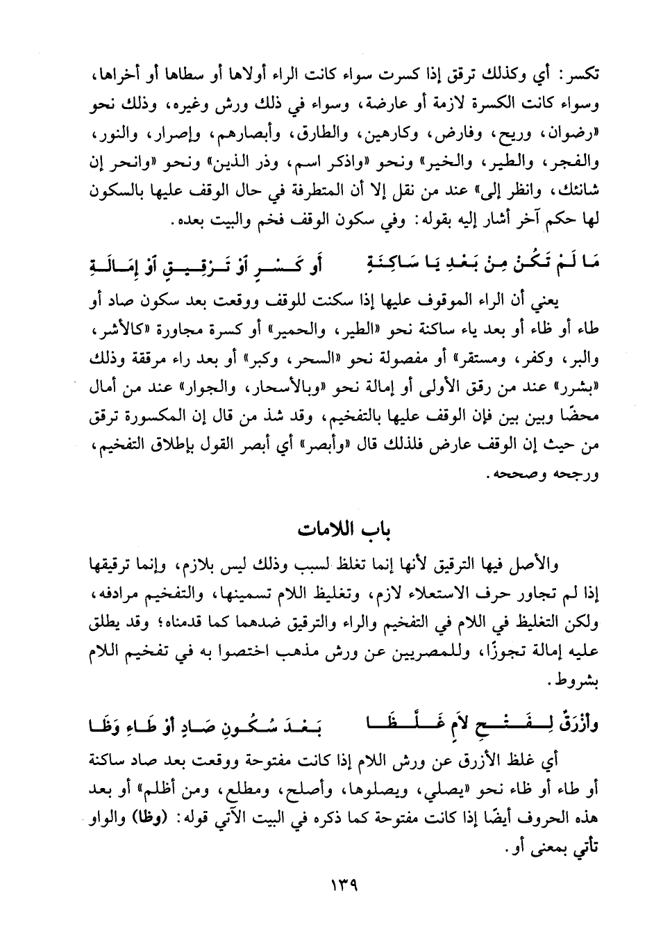 والأصل فيها الترقيق لأنها إنما تغلظ لسبب وذلك ليس بلازم، وإنما ترقيقها إذا لم تجاور حرف الاستعلاء لازم، وتغليظ اللام تسمينها، والتفخيم مرادفه، ولكن التغليظ في اللام في التفخيم والراء والترقيق ضدهما كما قدمناه؛ وقد يطلق عليه إمالة تجوزا، وللمصريين عن ورش مذهب اختصوا به في تفخيم اللام بشروط.