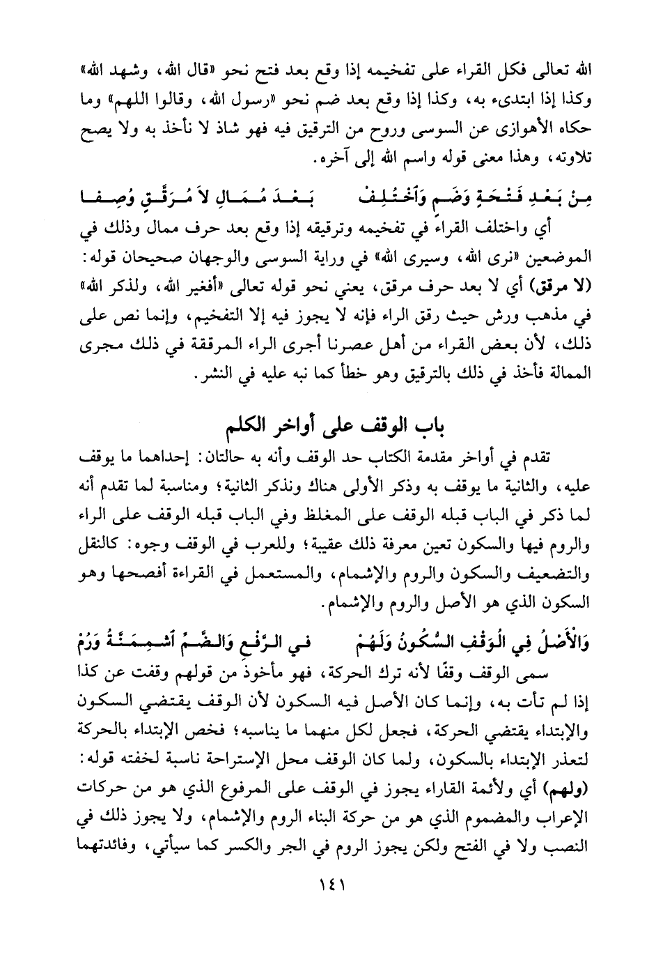 الله تعالى فكل القراء على تفخيمه إذا وقع بعد فتح نحو «قال الله، وشهد الله» وكذا إذا ابتدئ به، وكذا إذا وقع بعد ضم نحو «رسول الله، وقالوا اللهم» وما حكاه الأهوازى عن السوسى وروح من الترقيق فيه فهو شاذ لا نأخذ به ولا يصح تلاوته، وهذا معنى قوله واسم الله إلى آخره.