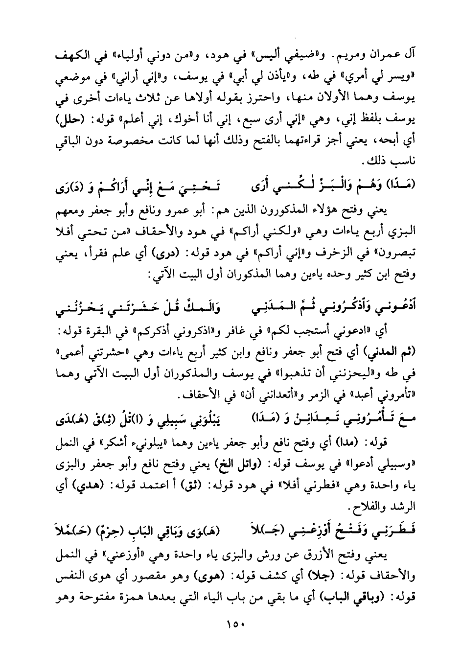 يعني وفتح هؤلاء المذكورون الذين هم: أبو عمرو ونافع وأبو جعفر ومعهم البزي أربع ياءات وهي «ولكني أراكم» في هود والأحقاف «من تحتي أفلا تبصرون» في الزخرف و «إني أراكم» في هود قوله: (درى) أي علم فقرأ، يعني وفتح ابن كثير وحده ياءين وهما المذكوران أول البيت الآتي: