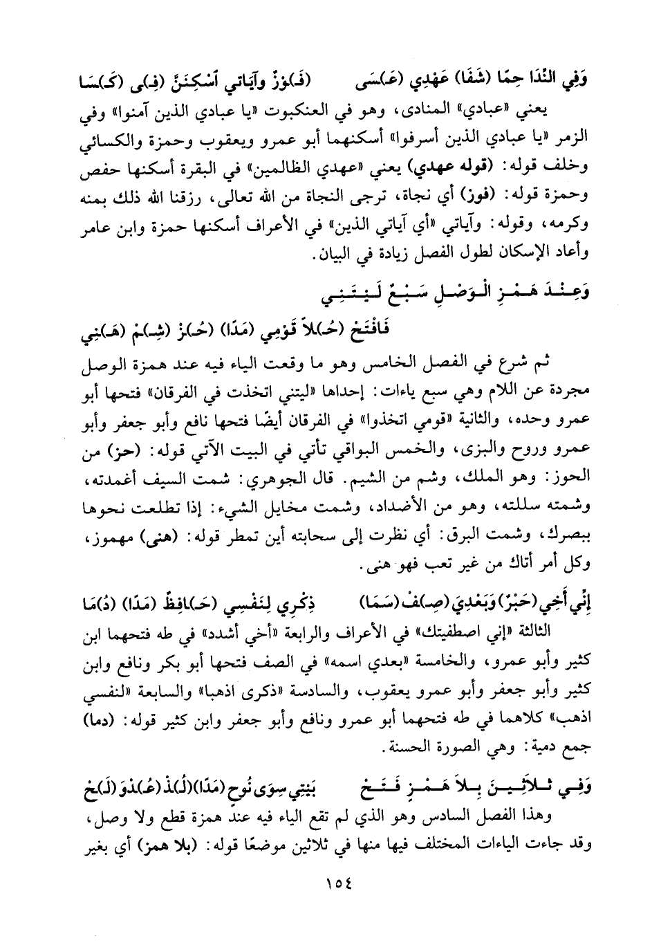 ثم شرع في الفصل الخامس وهو ما وقعت الياء فيه عند همزة الوصل مجردة عن اللام وهي سبع ياءات: إحداها «ليتني اتخذت في الفرقان» فتحها أبو عمرو وحده، والثانية «قومي اتخذوا» في الفرقان أيضا فتحها نافع وأبو جعفر وأبو عمرو وروح والبزى، والخمس البواقي تأتي في البيت الآتي قوله: (حز) من الحوز: وهو الملك، وشم من الشيم. قال الجوهري: شمت السيف أغمدته، وشمته سللته، وهو من الأضداد، وشمت مخايل الشيء: إذا تطلعت نحوها ببصرك، وشمت البرق: أي نظرت إلى سحابته أين تمطر قوله: (هنى) مهموز، وكل أمر أتاك من غير تعب فهو هنى.