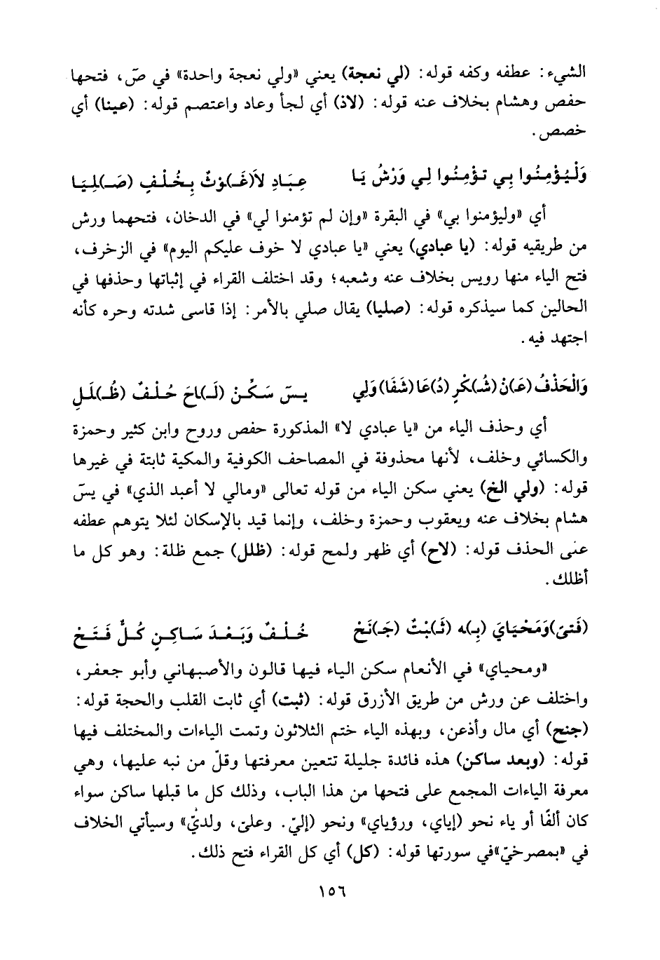 أي «وليؤمنوا بي» في البقرة «وإن لم تؤمنوا لي» في الدخان، فتحهما ورش من طريقيه قوله: (يا عبادي) يعني «يا عبادي لا خوف عليكم اليوم» في الزخرف، فتح الياء منها رويس بخلاف عنه وشعبه؛ وقد اختلف القراء في إثباتها وحذفها في الحالين كما سيذكره قوله: (صليا) يقال صلي بالأمر: إذا قاسى شدته وحره كأنه اجتهد فيه.