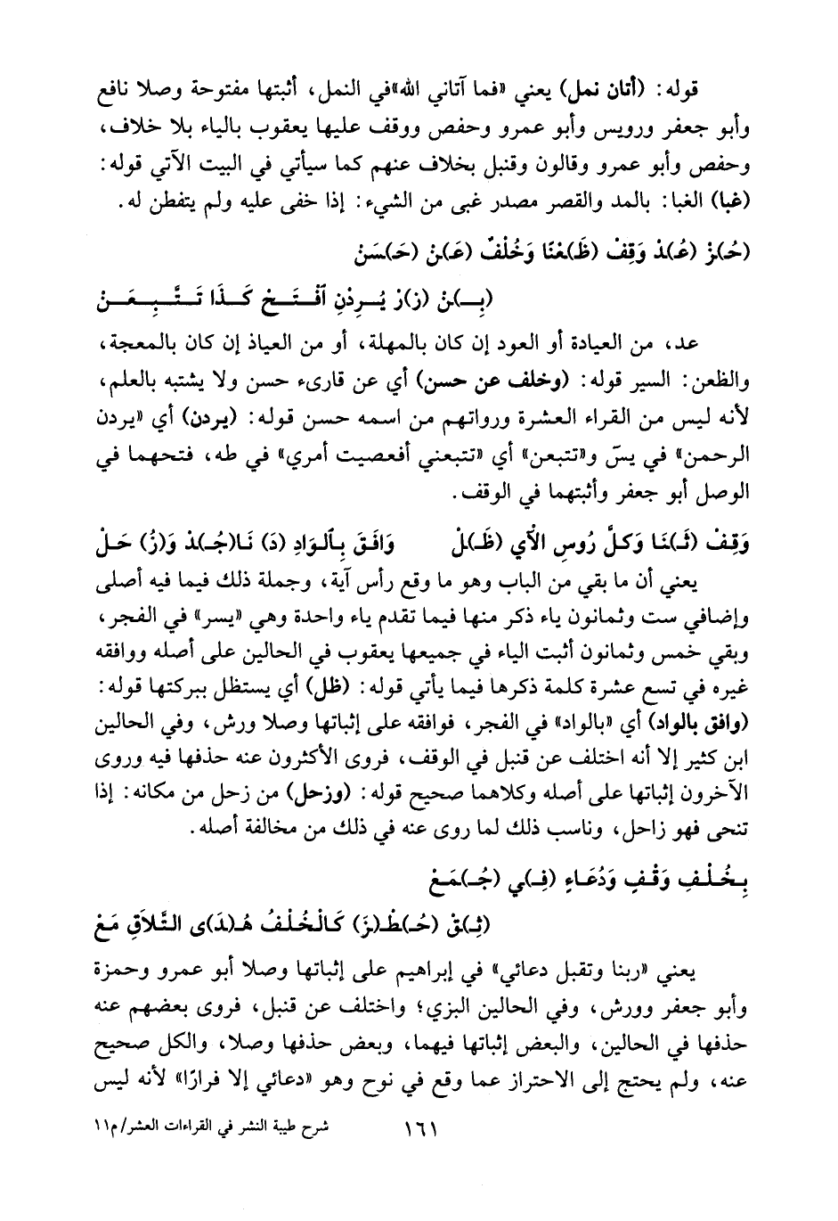 يعني «ربنا وتقبل دعائي» في إبراهيم على إثباتها وصلا أبو عمرو وحمزة وأبو جعفر وورش، وفي الحالين البزي؛ واختلف عن قنبل، فروى بعضهم عنه حذفها في الحالين، والبعض إثباتها فيهما، وبعض حذفها وصلا، والكل صحيح عنه، ولم يحتج إلى الاحتراز عما وقع في نوح وهو «دعائي إلا فرارا» لأنه ليس