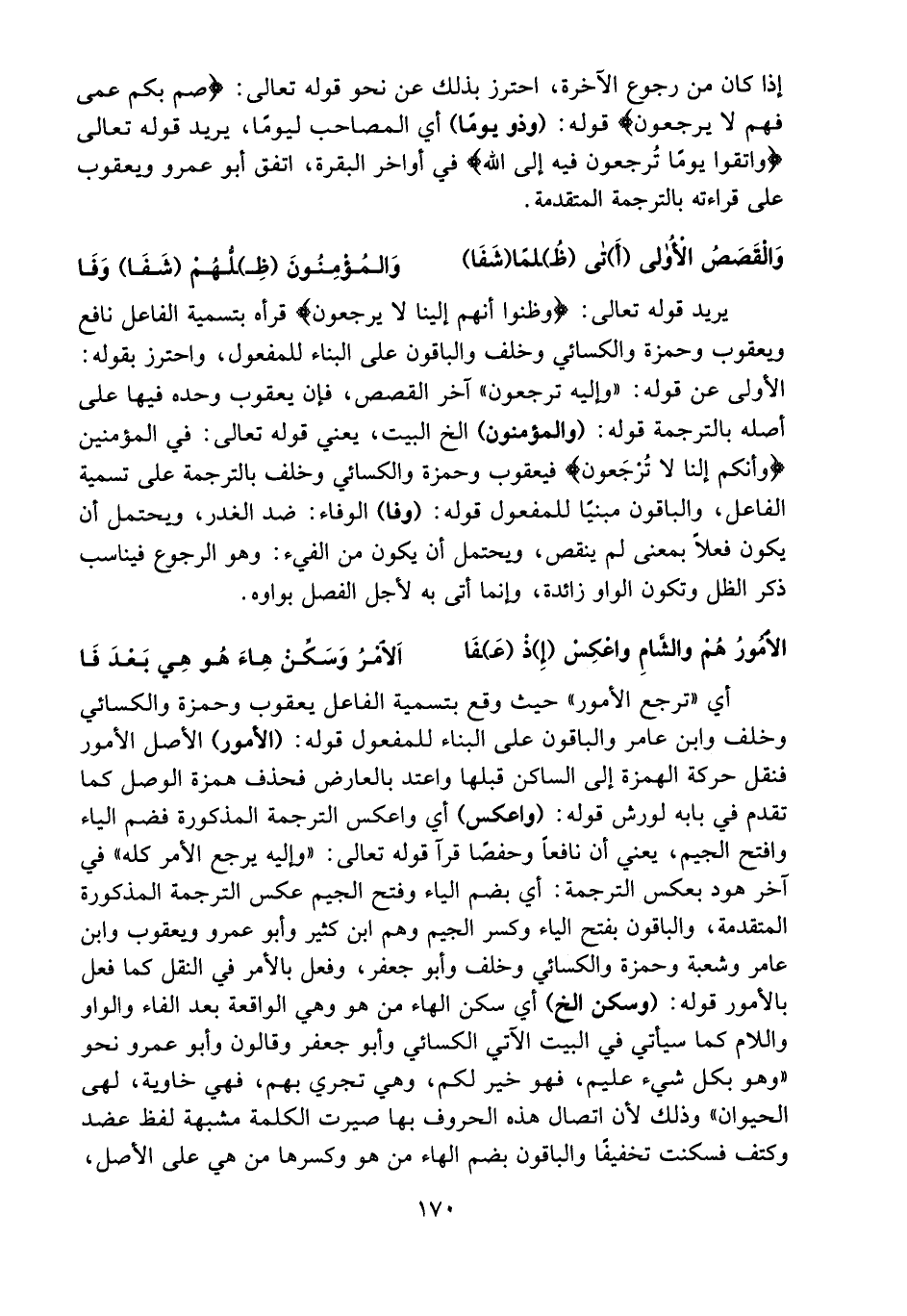 أي «ترجع الأمور» حيث وقع بتسمية الفاعل يعقوب وحمزة والكسائي وخلف وابن عامر والباقون على البناء للمفعول قوله: (الأمور) الأصل الأمور فنقل حركة الهمزة إلى الساكن قبلها واعتد بالعارض فحذف همزة الوصل كما تقدم في بابه لورش قوله: (واعكس) أي واعكس الترجمة المذكورة فضم الياء وافتح الجيم، يعني أن نافعا وحفصا قرآ قوله تعالى: «وإليه يرجع الأمر كله» في آخر هود بعكس الترجمة: أي بضم الياء وفتح الجيم عكس الترجمة المذكورة المتقدمة، والباقون بفتح الياء وكسر الجيم وهم ابن كثير وأبو عمرو ويعقوب وابن عامر وشعبة وحمزة والكسائي وخلف وأبو جعفر، وفعل بالأمر في النقل كما فعل بالأمور قوله: (وسكن الخ) أي سكن الهاء من هو وهي الواقعة بعد الفاء والواو واللام كما سيأتي في البيت الآتي الكسائي وأبو جعفر وقالون وأبو عمرو نحو «وهو بكل شيء عليم، فهو خير لكم، وهي تجري بهم، فهي خاوية، لهى الحيوان» وذلك لأن اتصال هذه الحروف بها صيرت الكلمة مشبهة لفظ عضد وكتف فسكنت تخفيفا والباقون بضم الهاء من هو وكسرها من هي على الأصل،