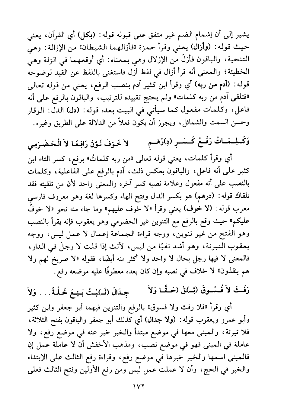 أي وقرأ كلمات، يعني قوله تعالى «من ربه كلمات» برفع، كسر التاء ابن كثير على أنه فاعل، والباقون بعكس ذلك، آدم بالرفع على الفاعلية، وكلمات بالنصب على أنه مفعول وعلامة نصبه كسر آخره والمعنى واحد لأن من تلقيته فقد تلقاك قوله: (درهم) هو بكسر الدال وفتح الهاء وكسرها لغة وهو معروف فارسي معرب قوله: (لا خوف) يعني وقرأ «لا خوف عليهم» وما جاء منه نحو «لا خوف عليكم» حيث وقع بالرفع مع التنوين غير الحضرمي وهو يعقوب فإنه يقرأ بالنصب وهو الفتح من غير تنوين، ووجه قراءة الجماعة إعمال لا عمل ليس، ووجه يعقوب التبرئة، وهو أشد نفيا من ليس، لأنك إذا قلت لا رجل في الدار، فالمعنى لا فيها رجل بحال لا واحد ولا أكثر منه أيضا، فقوله «لا صريخ لهم ولا هم ينقذون» لا خلاف في نصبه وإن كان بعده معطوفا عليه موضعه رفع.
