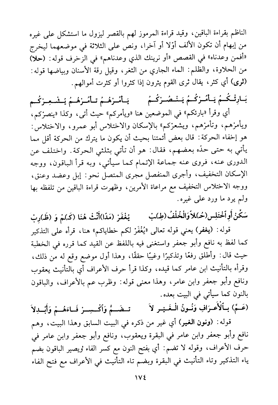 قوله: (يغفر) يعني قوله تعالى «يغفر لكم خطاياكم» هنا، قرأه على التذكير كما لفظ به نافع وأبو جعفر واستغنى فيه باللفظ عن القيد كما قرره في الخطبة حيث قال: وأطلق رفعا وتذكيرا وغيبا حققا، وهذا أول موضع وقع له من ذلك، وقرأه بالتأنيث ابن عامر كما قيده، وكذا قرأ حرف الأعراف أي بالتأنيث يعقوب ونافع وأبو جعفر وابن عامر، وهذا معنى قوله: وظرب عم بالأعراف، والباقون بالنون كما سيأتي في البيت بعده.