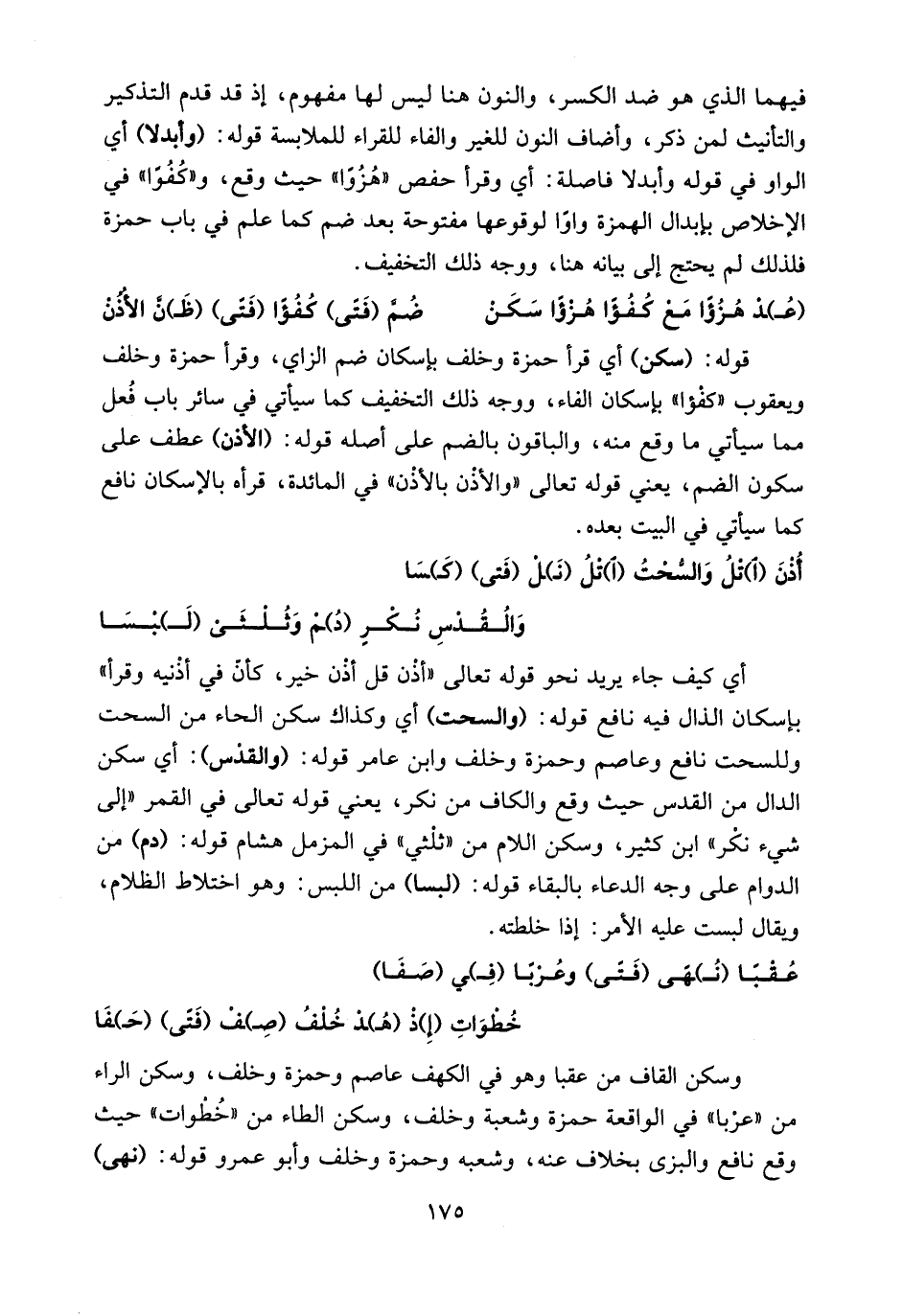 أي كيف جاء يريد نحو قوله تعالى «أذن قل أذن خير، كأنّ في أذنيه وقرأ» بإسكان الذال فيه نافع قوله: (والسحت) أي وكذاك سكن الحاء من السحت وللسحت نافع وعاصم وحمزة وخلف وابن عامر قوله: (والقدس): أي سكن الدال من القدس حيث وقع والكاف من نكر، يعني قوله تعالى في القمر «إلى شيء نكر» ابن كثير، وسكن اللام من «ثلثي» في المزمل هشام قوله: (دم) من الدوام على وجه الدعاء بالبقاء قوله: (لبسا) من اللبس: وهو اختلاط الظلام، ويقال لبست عليه الأمر: إذا خلطته.