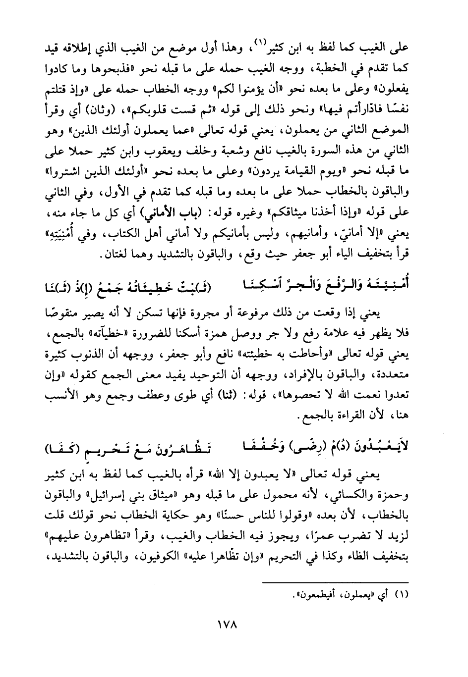 يعني قوله تعالى «لا يعبدون إلا الله» قرأه بالغيب كما لفظ به ابن كثير وحمزة والكسائي، لأنه محمول على ما قبله وهو «ميثاق بني إسرائيل» والباقون بالخطاب، لأن بعده «وقولوا للناس حسنا» وهو حكاية الخطاب نحو قولك قلت لزيد لا تضرب عمرا، ويجوز فيه الخطاب والغيب، وقرأ «تظاهرون عليهم» بتخفيف الظاء وكذا في التحريم «وإن تظّاهرا عليه» الكوفيون، والباقون بالتشديد،