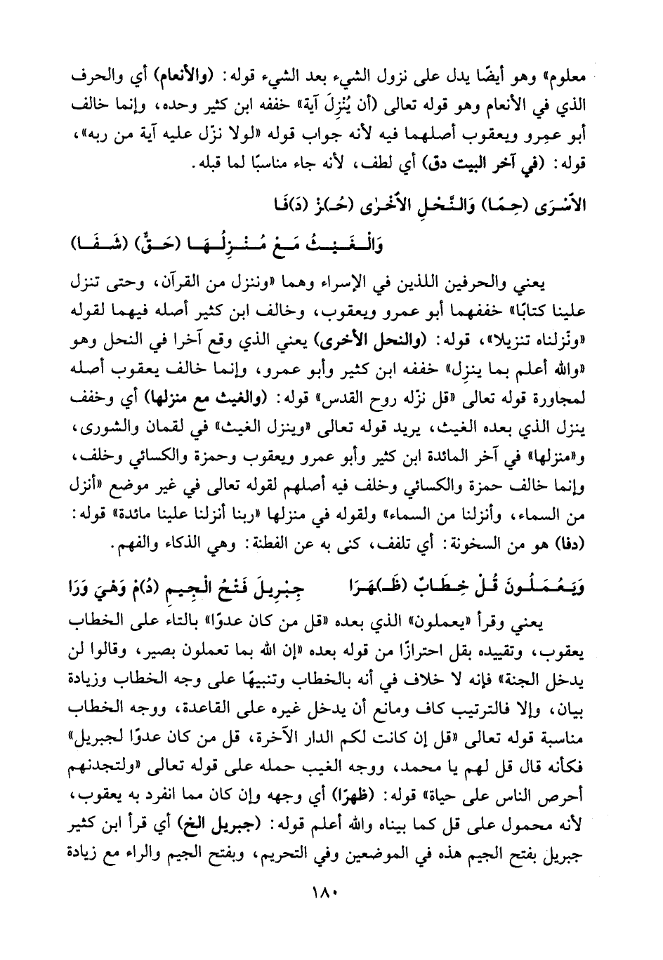 يعني والحرفين اللذين في الإسراء وهما «وننزل من القرآن، وحتى تنزل علينا كتابا» خففهما أبو عمرو ويعقوب، وخالف ابن كثير أصله فيهما لقوله «ونزّلناه تنزيلا»، قوله: (والنحل الأخرى) يعني الذي وقع آخرا في النحل وهو «والله أعلم بما ينزل» خففه ابن كثير وأبو عمرو، وإنما خالف يعقوب أصله لمجاورة قوله تعالى «قل نزّله روح القدس» قوله: (والغيث مع منزلها) أي وخفف ينزل الذي بعده الغيث، يريد قوله تعالى «وينزل الغيث» في لقمان والشورى، و «منزلها» في آخر المائدة ابن كثير وأبو عمرو ويعقوب وحمزة والكسائي وخلف، وإنما خالف حمزة والكسائي وخلف فيه أصلهم لقوله تعالى في غير موضع «أنزل من السماء، وأنزلنا من السماء»