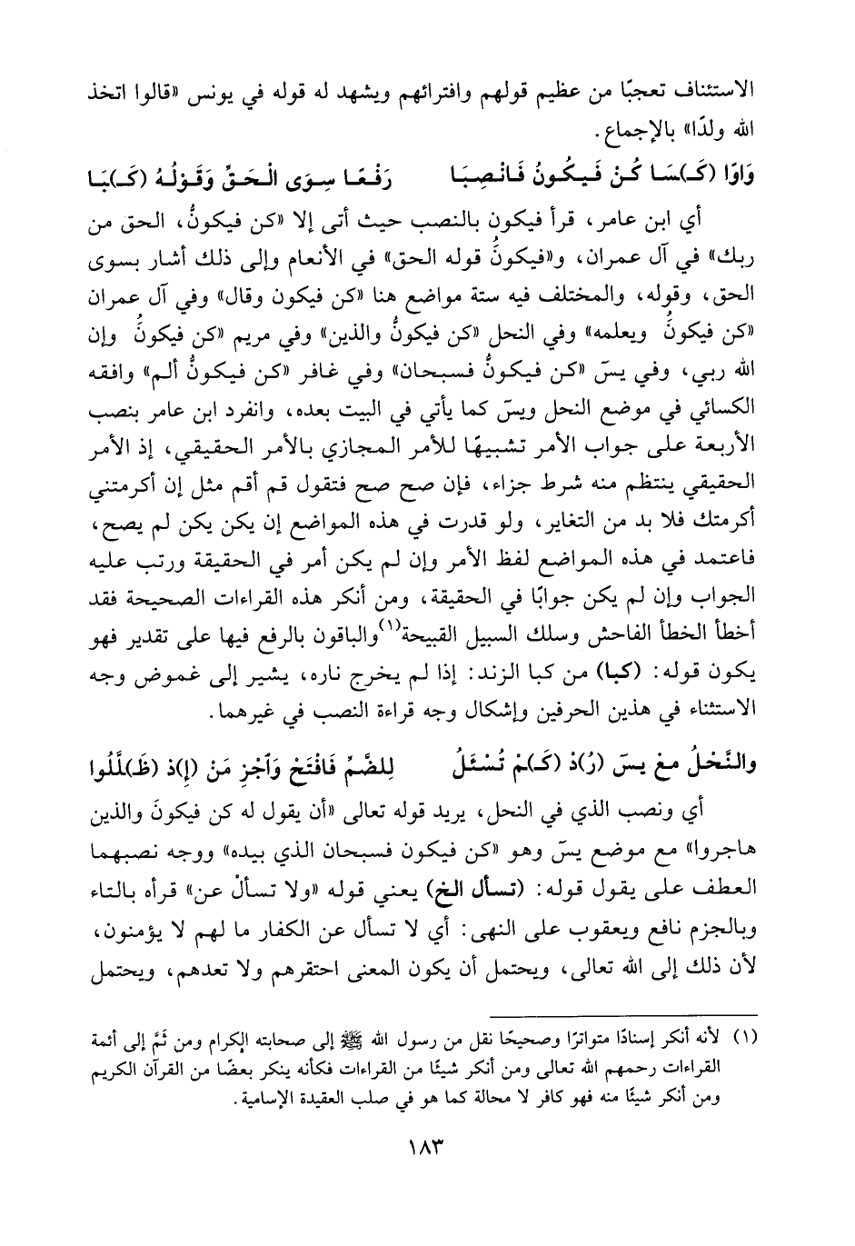 أي ونصب الذي في النحل، يريد قوله تعالى «أن يقول له كن فيكون والذين هاجروا» مع موضع يس وهو «كن فيكون فسبحان الذي بيده» ووجه نصبهما العطف على يقول قوله: (تسأل الخ) يعني قوله «ولا تسأل عن» قرأه بالتاء وبالجزم نافع ويعقوب على النهى: أي لا تسأل عن الكفار ما لهم لا يؤمنون، لأن ذلك إلى الله تعالى، ويحتمل أن يكون المعنى احتقرهم ولا تعدهم، ويحتمل