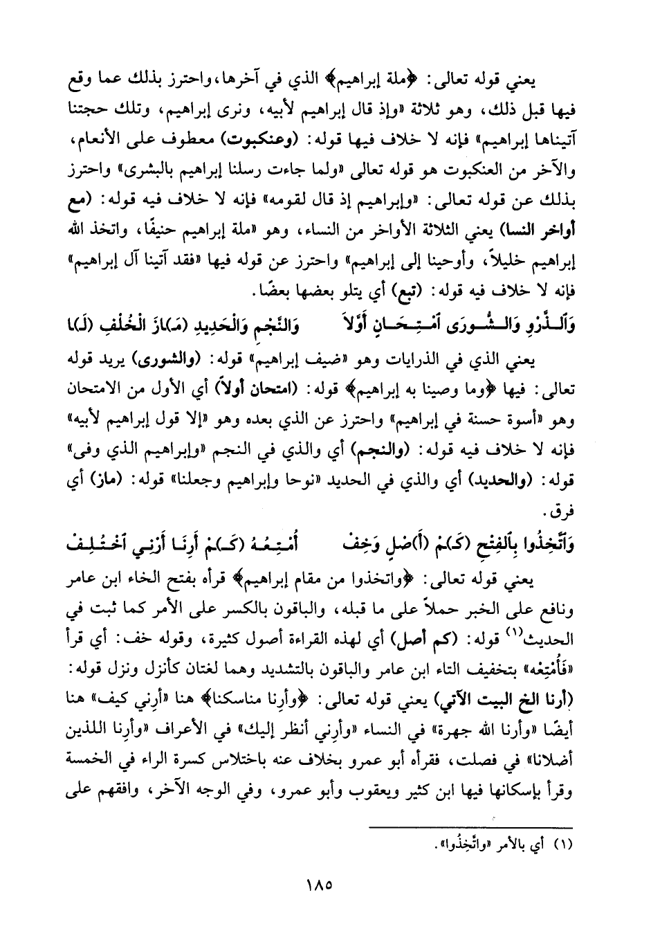 يعني قوله تعالى: ملة إبراهيم الذي في آخرها، واحترز بذلك عما وقع فيها قبل ذلك، وهو ثلاثة «وإذ قال إبراهيم لأبيه، ونرى إبراهيم، وتلك حجتنا آتيناها إبراهيم» فإنه لا خلاف فيها قوله: (وعنكبوت) معطوف على الأنعام، والآخر من العنكبوت هو قوله تعالى «ولما جاءت رسلنا إبراهيم بالبشرى» واحترز بذلك عن قوله تعالى: «وإبراهيم إذ قال لقومه» فإنه لا خلاف فيه قوله: (مع أواخر النسا) يعني الثلاثة الأواخر من النساء، وهو «ملة إبراهيم حنيفا، واتخذ الله إبراهيم خليلا، وأوحينا إلى إبراهيم» واحترز عن قوله فيها «فقد آتينا آل إبراهيم» فإنه لا خلاف فيه قوله: (تبع) أي يتلو بعضها بعضا.