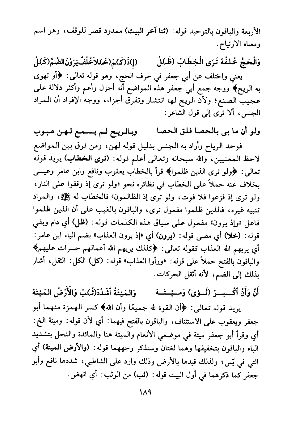 فوحد الرياح وأراد به الجنس بدليل قوله لهن، ومن فرق بين المواضع لاحظ المعنيين، والله سبحانه وتعالى أعلم قوله: (ترى الخطاب) يريد قوله تعالى: ولو ترى الذين ظلموا قرأ بالخطاب يعقوب ونافع وابن عامر وعيسى بخلاف عنه حملا على الخطاب في نظائره نحو «ولو ترى إذ وقفوا على النار، ولو ترى إذ فزعوا فلا فوت، ولو ترى إذ الظالمون» فالخطاب له صلى الله عليه وسلم، والمراد تنبيه غيره، فالذين ظلموا مفعول ترى، والباقون بالغيب على أن الذين ظلموا فاعل «وإذ يرون» مفعول على سياق هذه الكلمات قوله: (ظل) أي دام وبقي قوله: (خلا) أي مضى قوله: (يرون) أي «إذ يرون العذاب» بضم الياء ابن عامر:
