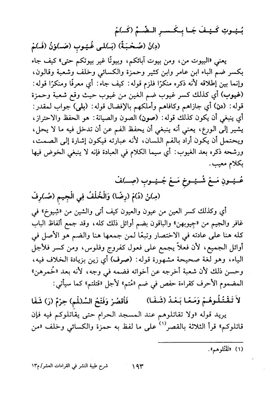 يعني «البيوت من، ومن بيوت آبائكم، وبيوتا غير بيوتكم حتى» كيف جاء بكسر ضم الباء ابن عامر وابن كثير وحمزة والكسائي وخلف وشعبة وقالون، وإنما بين إطلاقه لأنه ذكره منكرا فلزم قوله: كيف جاء: أي معرفا ومنكرا قوله: