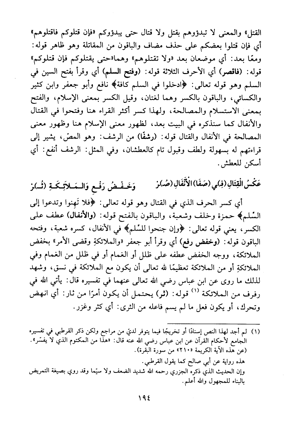 أي كسر الحرف الذي في القتال وهو قوله تعالى: فلا تهنوا وتدعوا إلى السّلم حمزة وخلف وشعبة، والباقون بالفتح قوله: (والأنفال) عطف على الكسر، يعني قوله تعالى: وإن جنحوا للسّلم في الأنفال، كسره شعبة، وفتحه الباقون قوله: (وخفض رفع) أي وقرأ أبو جعفر «والملائكة وقضى الأمر» بخفض الملائكة، ووجه الخفض عطفه على ظلل أو الغمام أو في ظلل من الغمام وفي الملائكة أو من الملائكة تعظيما لله تعالى أن يكون مع الملائكة في نسق، وشهد لذلك ما روى عن ابن عباس رضي الله تعالى عنهما في تفسيره قال: يأتي الله في رفرف من الملائكة (¬1) قوله: (ثر) يحتمل أن يكون أمرا من ثار: أي انهض وتحرك، أو يكون فعل ما لم يسم فاعله من الثرى: أي كثر وغزر.