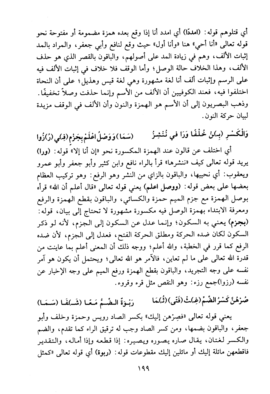 أي اختلف عن قالون عند الهمزة المكسورة نحو «إن أنا إلا» قوله: (ورا) يريد قوله تعالى كيف «ننشرها» قرأ بالراء نافع وابن كثير وأبو جعفر وأبو عمرو ويعقوب: أي نحييها، والباقون بالزاي من النشر وهو الرفع: وهو تركيب العظام بعضها على بعض قوله: (ووصل اعلم) يعني قوله تعالى «قال أعلم أن الله» قرأه بوصل الهمزة مع جزم الميم حمزة والكسائي، والباقون بقطع الهمزة والرفع ومعرفة الابتداء بهمزة الوصل فيه مكسورة مشهورة لا تحتاج إلى بيان، قوله: