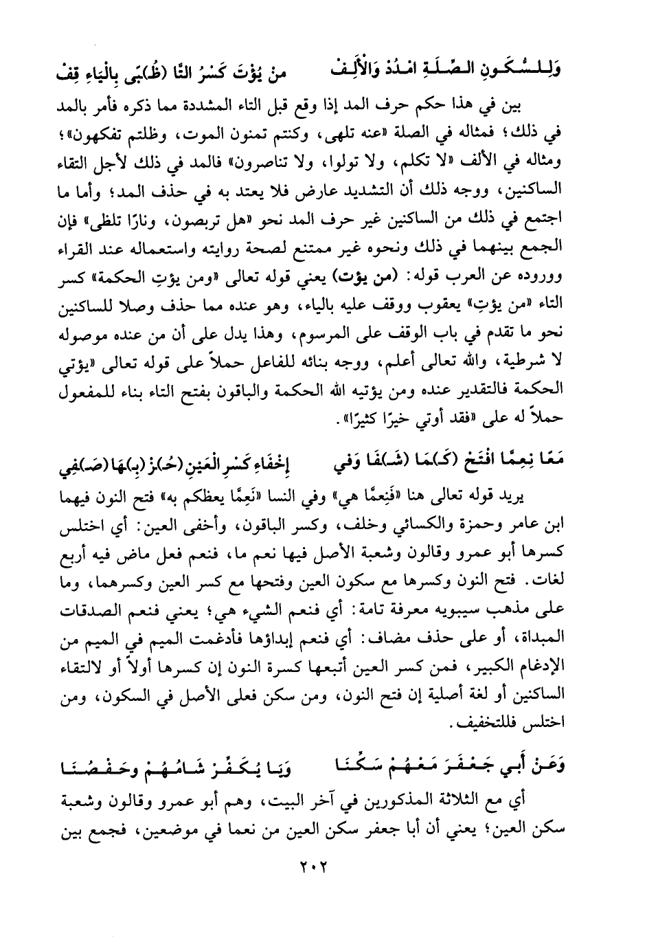 بين في هذا حكم حرف المد إذا وقع قبل التاء المشددة مما ذكره فأمر بالمد في ذلك؛ فمثاله في الصلة «عنه تلهى، وكنتم تمنون الموت، وظلتم تفكهون»؛ ومثاله في الألف «لا تكلم، ولا تولوا، ولا تناصرون» فالمد في ذلك لأجل التقاء الساكنين، ووجه ذلك أن التشديد عارض فلا يعتد به في حذف المد؛ وأما ما اجتمع في ذلك من الساكنين غير حرف المد نحو «هل تربصون، ونارا تلظى» فإن الجمع بينهما في ذلك ونحوه غير ممتنع لصحة روايته واستعماله عند القراء ووروده عن العرب قوله: (من يؤت) يعني قوله تعالى «ومن يؤت الحكمة» كسر التاء «من يؤت» يعقوب ووقف عليه بالياء، وهو عنده مما حذف وصلا للساكنين نحو ما تقدم في باب الوقف على المرسوم، وهذا يدل على أن من عنده موصوله لا شرطية، والله تعالى أعلم، ووجه بنائه للفاعل حملا على قوله تعالى «يؤتي الحكمة فالتقدير عنده ومن يؤتيه الله الحكمة والباقون بفتح التاء بناء للمفعول حملا له على «فقد أوتي خيرا كثيرا».