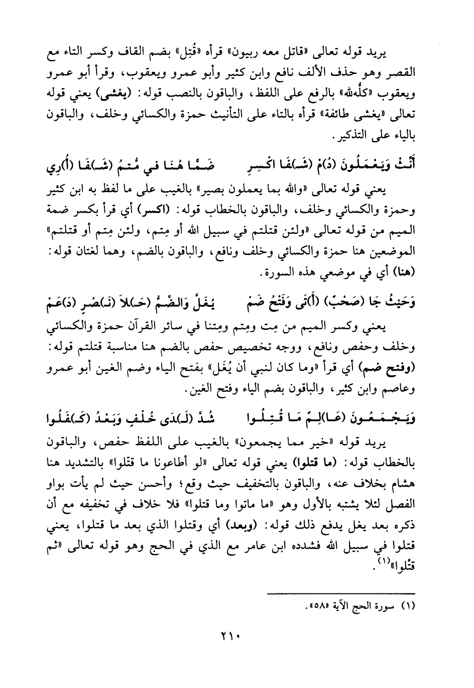 يريد قوله «خير مما يجمعون» بالغيب على اللفظ حفص، والباقون بالخطاب قوله: (ما قتلوا) يعني قوله تعالى «لو أطاعونا ما قتّلوا» بالتشديد هنا هشام بخلاف عنه، والباقون بالتخفيف حيث وقع؛ وأحسن حيث لم يأت بواو الفصل لئلا يشتبه بالأول وهو «ما ماتوا وما قتلوا» فلا خلاف في تخفيفه مع أن ذكره بعد يغل يدفع ذلك قوله: (وبعد) أي وقتلوا الذي بعد ما قتلوا، يعني قتلوا في سبيل الله فشدده ابن عامر مع الذي في الحج وهو قوله تعالى «ثم قتّلوا» (¬1).