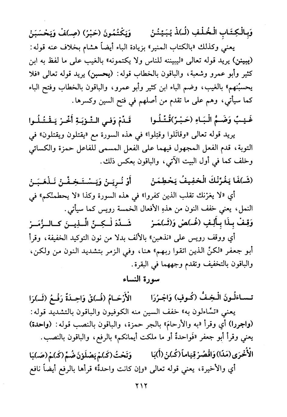 (يبينن) يريد قوله تعالى «ليبيننه للناس ولا يكتمونه» بالغيب على ما لفظ به ابن كثير وأبو عمرو وشعبة، والباقون بالخطاب قوله: (يحسبن) يريد قوله تعالى «فلا يحسبنهم» بالغيب، وضم الباء ابن كثير وأبو عمرو، والباقون بالخطاب وفتح الباء كما سيأتي، وهم على ما تقدم من أصلهم في فتح السين وكسرها.