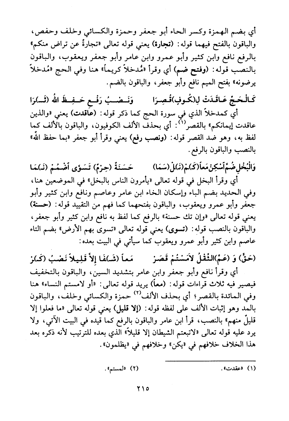 أي بضم الهمزة وكسر الحاء أبو جعفر وحمزة والكسائي وخلف وحفص، والباقون بالفتح فيهما قوله: (تجارة) يعني قوله تعالى «تجارة عن تراض منكم» بالرفع نافع وابن كثير وأبو عمرو وابن عامر وأبو جعفر ويعقوب، والباقون بالنصب قوله: (وفتح ضم) أي وقرأ «مّدخلا كريما» هنا وفي الحج «مدخلا يرضونه» بفتح الميم نافع وأبو جعفر، والباقون بالضم.