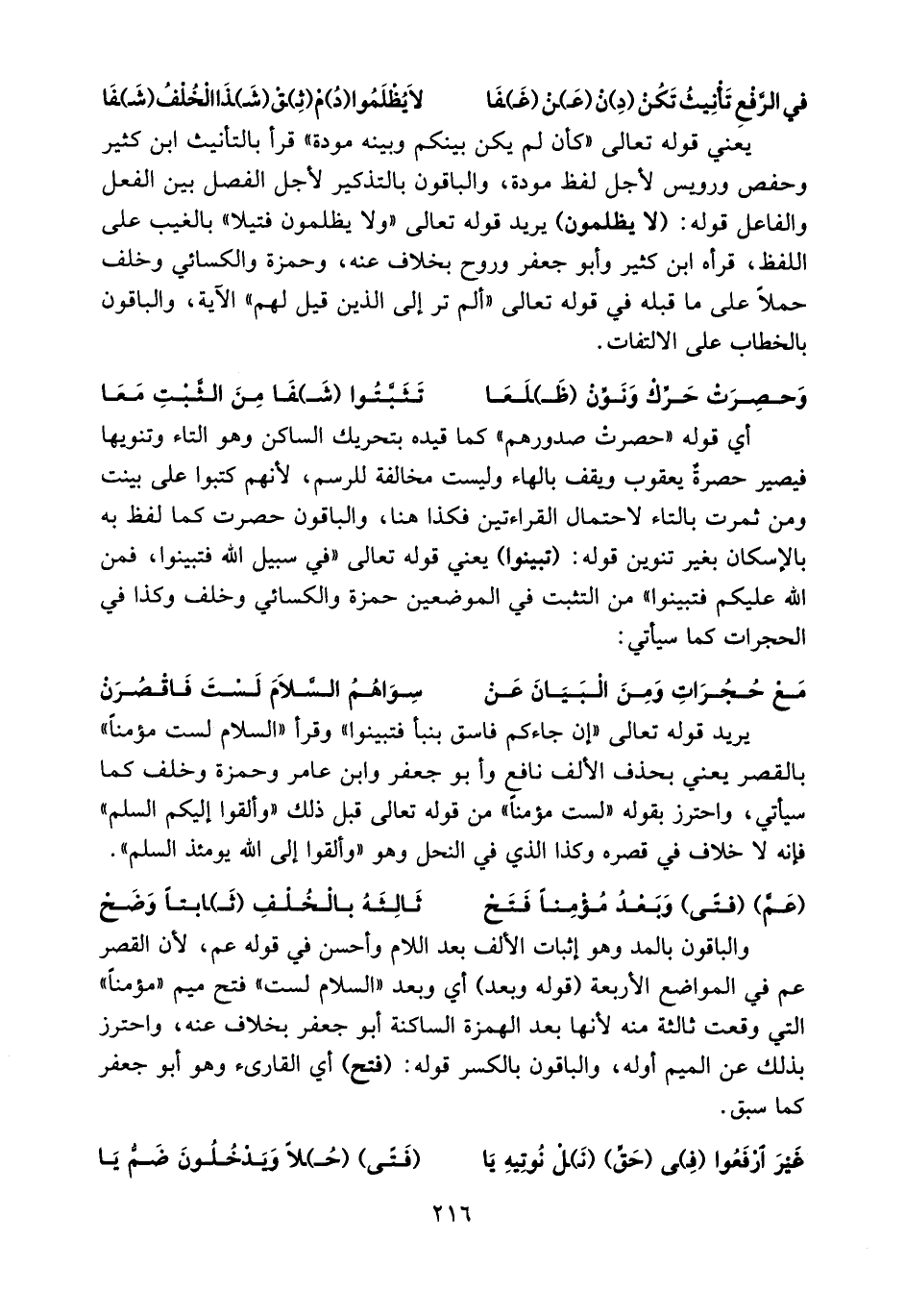 أي قوله «حصرت صدورهم» كما قيده بتحريك الساكن وهو التاء وتنويها فيصير حصرة يعقوب ويقف بالهاء وليست مخالفة للرسم، لأنهم كتبوا على بينت ومن ثمرت بالتاء لاحتمال القراءتين فكذا هنا، والباقون حصرت كما لفظ به بالإسكان بغير تنوين قوله: (تبينوا) يعني قوله تعالى «في سبيل الله فتبينوا، فمن الله عليكم فتبينوا» من التثبت في الموضعين حمزة والكسائي وخلف وكذا في الحجرات كما سيأتي: