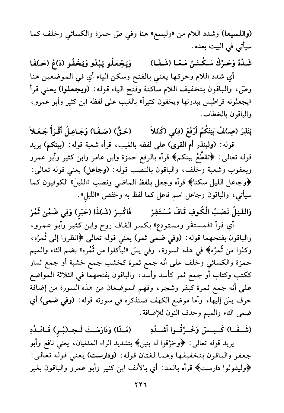 قوله: (ولينذر أم القرى) على لفظه بالغيب، قرأه شعبة قوله: (بينكم) يريد قوله تعالى: تقطّع بينكم قرأه بالرفع حمزة وابن عامر وابن كثير وأبو عمرو ويعقوب وشعبة وخلف، والباقون بالنصب قوله: (وجاعل) يعني قوله تعالى: