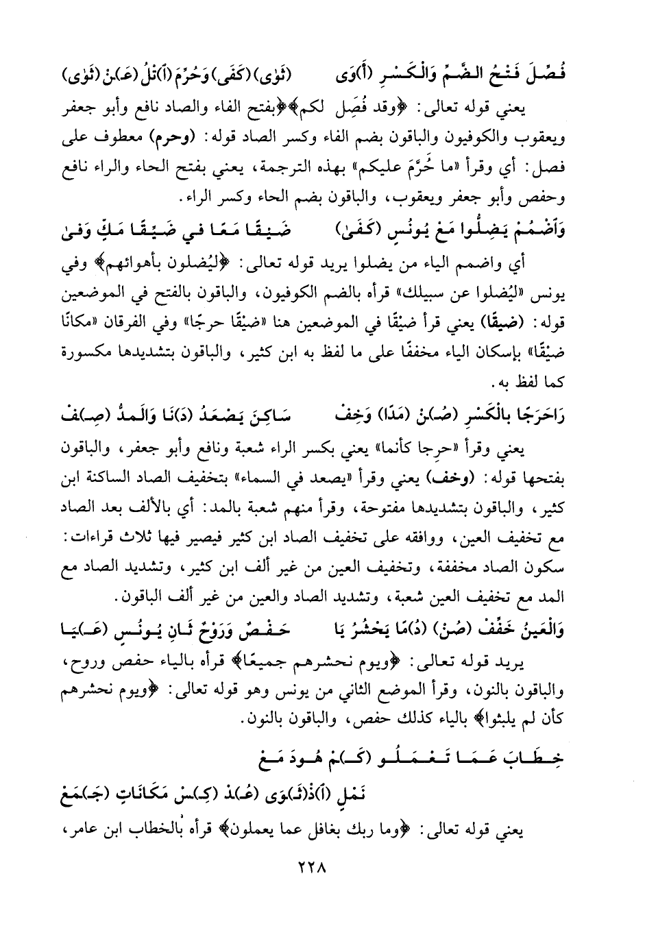 يعني وقرأ «حرجا كأنما» يعني بكسر الراء شعبة ونافع وأبو جعفر، والباقون بفتحها قوله: (وخف) يعني وقرأ «يصعد في السماء» بتخفيف الصاد الساكنة ابن كثير، والباقون بتشديدها مفتوحة، وقرأ منهم شعبة بالمد: أي بالألف بعد الصاد مع تخفيف العين، ووافقه على تخفيف الصاد ابن كثير فيصير فيها ثلاث قراءات: