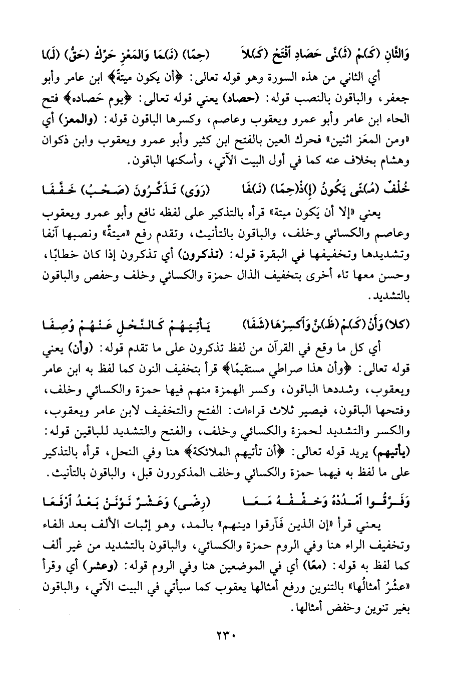 يعني «إلا أن يكون ميتة» قرأه بالتذكير على لفظه نافع وأبو عمرو ويعقوب وعاصم والكسائي وخلف، والباقون بالتأنيث، وتقدم رفع «ميتة» ونصبها آنفا وتشديدها وتخفيفها في البقرة قوله: (تذكرون) أي تذكرون إذا كان خطابا، وحسن معها تاء أخرى بتخفيف الذال حمزة والكسائي وخلف وحفص والباقون بالتشديد.