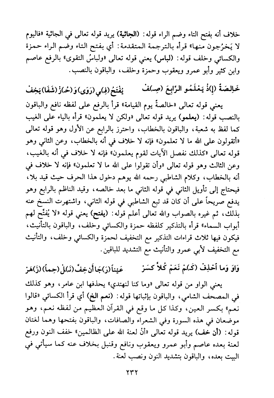 يعني قوله تعالى «خالصة يوم القيامة» قرأ بالرفع على لفظه نافع والباقون بالنصب قوله: (يعلمو) يريد قوله تعالى «ولكن لا يعلمون» قرأه بالياء على الغيب كما لفظ به شعبة، والباقون بالخطاب، واحترز بالرابع عن الأول وهو قوله تعالى «أتقولون على الله ما لا تعلمون» فإنه لا خلاف في أنه بالخطاب، وعن الثاني وهو قوله تعالى «كذلك نفصل الآيات لقوم يعلمون» فإنه لا خلاف في أنه بالغيب، وعن الثالث وهو قوله تعالى «وأن تقولوا على الله ما لا تعلمون» فإنه لا خلاف في أنه بالخطاب، وكلام الشاطبي رحمه الله يوهم دخول هذا الحرف حيث قيد بلا، فيحتاج إلى تأويل الثاني في قوله الثاني ما بعد خالصه، وقيد الناظم بالرابع وهو يدفع صريحا على أن كان قد تبع الشاطبي في قوله الثاني، واشتهرت النسخ عنه بذلك، ثم غيره بالصواب والله تعالى أعلم قوله: (يفتح) يعني قوله «لا يفتّح لهم أبواب السماء» قرأه بالتذكير كلفظه حمزة والكسائي وخلف، والباقون بالتأنيث، فيكون فيها ثلاث قراءات التذكير مع التخفيف لحمزة والكسائي وخلف، والتأنيث مع التخفيف لأبي عمرو والتأنيث مع التشديد للباقين.