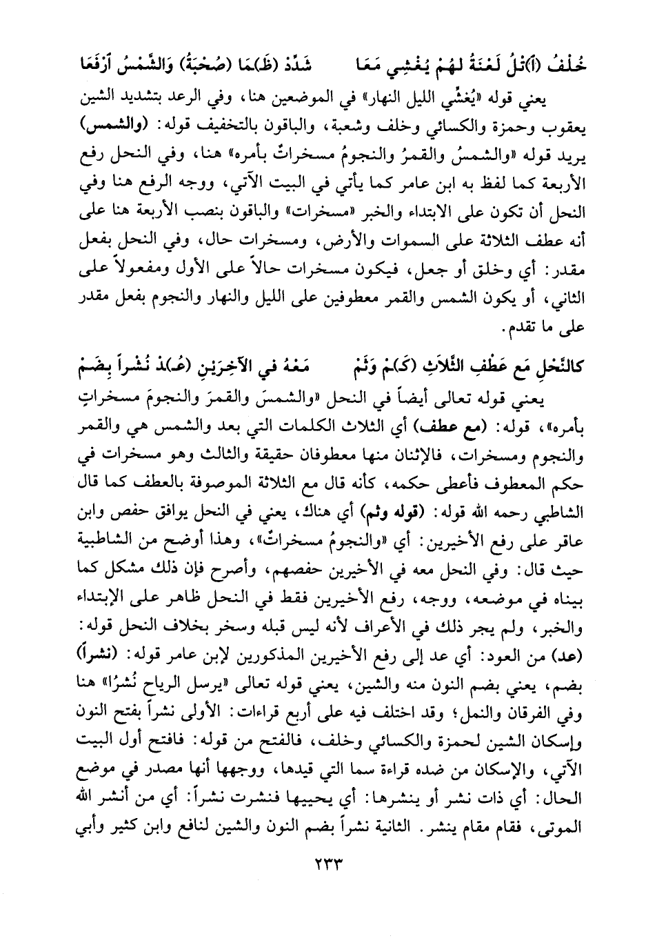 يعني قوله «يغشّي الليل النهار» في الموضعين هنا، وفي الرعد بتشديد الشين يعقوب وحمزة والكسائي وخلف وشعبة، والباقون بالتخفيف قوله: (والشمس) يريد قوله «والشمس والقمر والنجوم مسخرات بأمره» هنا، وفي النحل رفع الأربعة كما لفظ به ابن عامر كما يأتي في البيت الآتي، ووجه الرفع هنا وفي النحل أن تكون على الابتداء والخبر «مسخرات» والباقون بنصب الأربعة هنا على أنه عطف الثلاثة على السموات والأرض، ومسخرات حال، وفي النحل بفعل مقدر: أي وخلق أو جعل، فيكون مسخرات حالا على الأول ومفعولا على الثاني، أو يكون الشمس والقمر معطوفين على الليل والنهار والنجوم بفعل مقدر على ما تقدم.