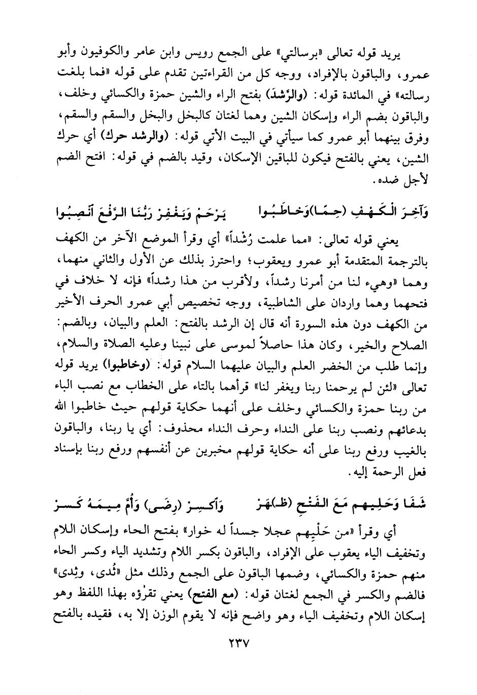 يريد قوله تعالى «برسالتي» على الجمع رويس وابن عامر والكوفيون وأبو عمرو، والباقون بالإفراد، ووجه كل من القراءتين تقدم على قوله «فما بلغت رسالته» في المائدة قوله: (والرّشد) بفتح الراء والشين حمزة والكسائي وخلف، والباقون بضم الراء وإسكان الشين وهما لغتان كالبخل والبخل والسقم والسقم، وفرق بينهما أبو عمرو كما سيأتي في البيت الأتي قوله: (والرشد حرك) أي حرك الشين، يعني بالفتح فيكون للباقين الإسكان، وقيد بالضم في قوله: افتح الضم لأجل ضده.