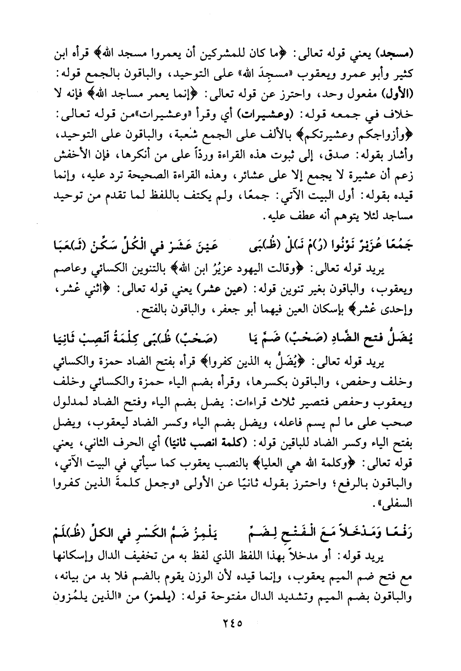 يريد قوله تعالى: يضلّ به الذين كفروا قرأه بفتح الضاد حمزة والكسائي وخلف وحفص، والباقون بكسرها، وقرأه بضم الياء حمزة والكسائي وخلف ويعقوب وحفص فتصير ثلاث قراءات: يضل بضم الياء وفتح الضاد لمدلول صحب على ما لم يسم فاعله، ويضل بضم الياء وكسر الضاد ليعقوب، ويضل بفتح الياء وكسر الضاد للباقين قوله: (كلمة انصب ثانيا) أي الحرف الثاني، يعني قوله تعالى: وكلمة الله هي العليا بالنصب يعقوب كما سيأتي في البيت الآتي، والباقون بالرفع؛ واحترز بقوله ثانيا عن الأولى «وجعل كلمة الذين كفروا السفلى».