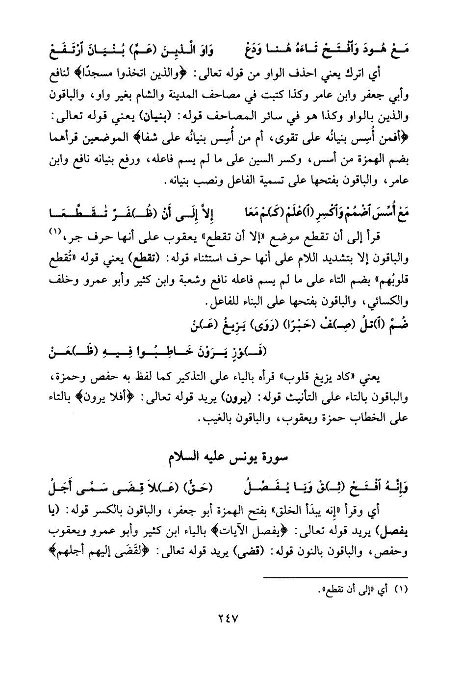 أفمن أسس بنيانه على تقوى، أم من أسس بنيانه على شفا الموضعين قرأهما بضم الهمزة من أسس، وكسر السين على ما لم يسم فاعله، ورفع بنيانه نافع وابن عامر، والباقون بفتحها على تسمية الفاعل ونصب بنيانه.