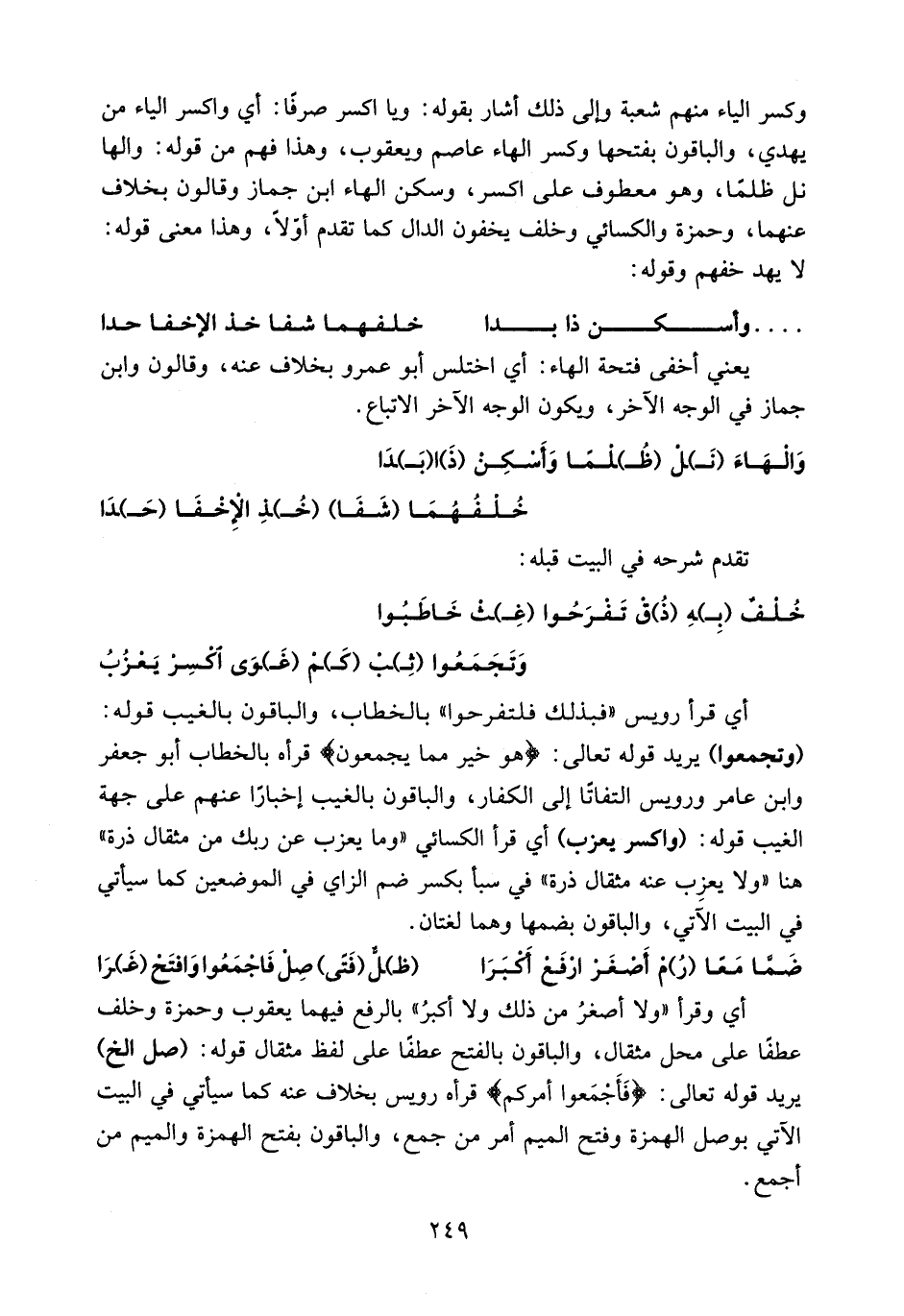 وكسر الياء منهم شعبة وإلى ذلك أشار بقوله: ويا اكسر صرفا: أي واكسر الياء من يهدي، والباقون بفتحها وكسر الهاء عاصم ويعقوب، وهذا فهم من قوله: والها نل ظلما، وهو معطوف على اكسر، وسكن الهاء ابن جماز وقالون بخلاف عنهما، وحمزة والكسائي وخلف يخفون الدال كما تقدم أوّلا، وهذا معنى قوله: