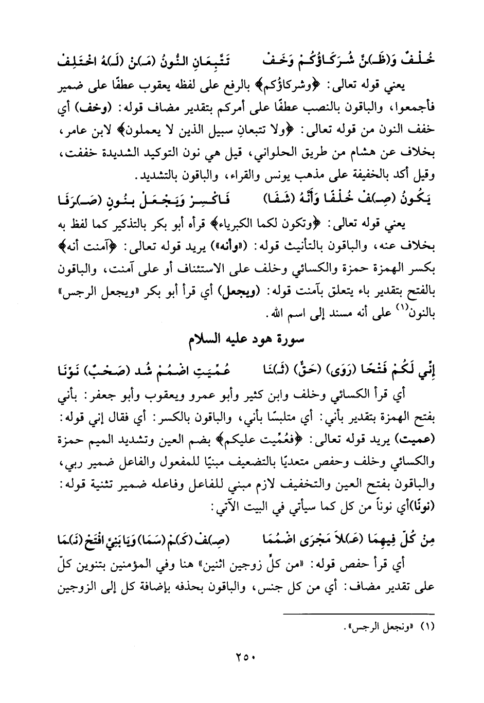 يعني قوله تعالى: وشركاؤكم بالرفع على لفظه يعقوب عطفا على ضمير فأجمعوا، والباقون بالنصب عطفا على أمركم بتقدير مضاف قوله: (وخف) أي خفف النون من قوله تعالى: ولا تتبعان سبيل الذين لا يعملون لابن عامر، بخلاف عن هشام من طريق الحلواني، قيل هي نون التوكيد الشديدة خففت، وقيل أكد بالخفيفة على مذهب يونس والقراء، والباقون بالتشديد.