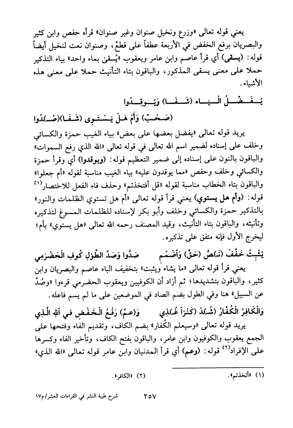 يريد قوله تعالى «يفضل بعضها على بعض» بياء الغيب حمزة والكسائي وخلف على إسناده لضمير اسم الله تعالى في قوله تعالى «الله الذي رفع السموات» والباقون بالنون على إسناده إلى ضمير التعظيم قوله: (ويوقدوا) أي وقرأ حمزة والكسائي وخلف وحفص «مما يوقدون عليه» بياء الغيب مناسبة لقوله «أم جعلوا» والباقون بتاء الخطاب مناسبة لقوله «قل أفتخذتم» وحذف فاء الفعل للاختصار (¬1) قوله: (وأم هل يستوي) يعني قرأ قوله تعالى «أم هل تستوي الظلمات والنور» بالتذكير حمزة والكسائي وخلف وأبو بكر لإسناده للظلمات المسوغ لتذكيره وتأنيثه، والباقون بتاء التأنيث، وقيد المصنف رحمه الله تعالى «هل يستوي» بأم؛ ليخرج الأول فإنه متفق على تذكيره.