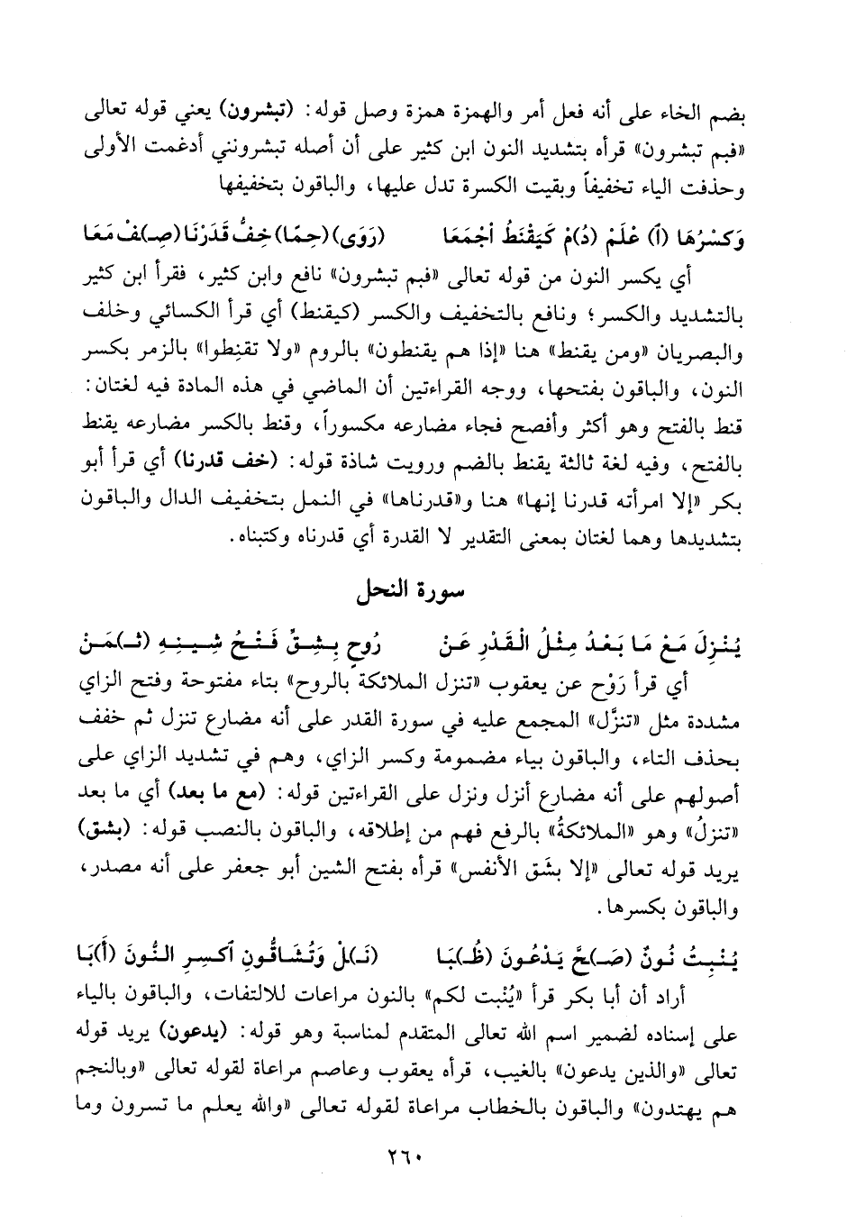 أي قرأ روح عن يعقوب «تنزل الملائكة بالروح» بتاء مفتوحة وفتح الزاي مشددة مثل «تنزّل» المجمع عليه في سورة القدر على أنه مضارع تنزل ثم خفف بحذف التاء، والباقون بياء مضمومة وكسر الزاي، وهم في تشديد الزاي على أصولهم على أنه مضارع أنزل ونزل على القراءتين قوله: (مع ما بعد) أي ما بعد «تنزل» وهو «الملائكة» بالرفع فهم من إطلاقه، والباقون بالنصب قوله: (بشق) يريد قوله تعالى «إلا بشق الأنفس» قرأه بفتح الشين أبو جعفر على أنه مصدر، والباقون بكسرها.