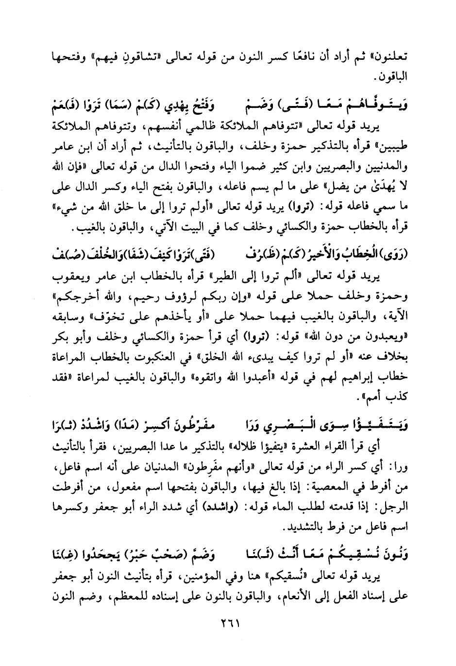 يريد قوله تعالى «تتوفاهم الملائكة ظالمي أنفسهم، وتتوفاهم الملائكة طيبين» قرأه بالتذكير حمزة وخلف، والباقون بالتأنيث، ثم أراد أن ابن عامر والمدنيين والبصريين وابن كثير ضموا الياء وفتحوا الدال من قوله تعالى «فإن الله لا يهدى من يضل» على ما لم يسم فاعله، والباقون بفتح الياء وكسر الدال على ما سمي فاعله قوله: (تروا) يريد قوله تعالى «أو لم تروا إلى ما خلق الله من شيء» قرأه بالخطاب حمزة والكسائي وخلف كما في البيت الآتي، والباقون بالغيب.