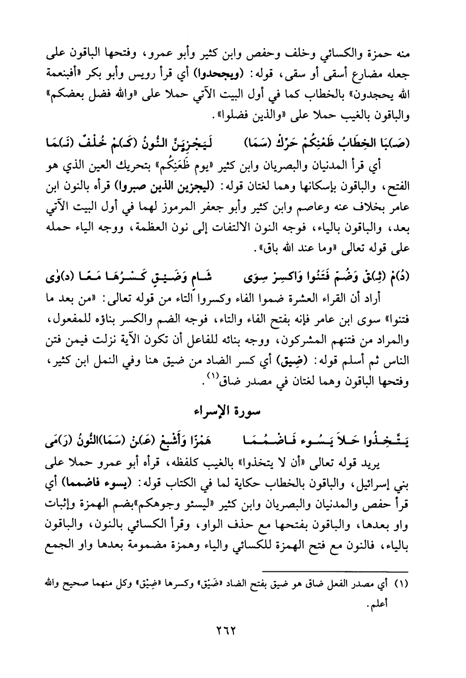 أراد أن القراء العشرة ضموا الفاء وكسروا التاء من قوله تعالى: «من بعد ما فتنوا» سوى ابن عامر فإنه بفتح الفاء والتاء، فوجه الضم والكسر بناؤه للمفعول، والمراد من فتنهم المشركون، ووجه بنائه للفاعل أن تكون الآية نزلت فيمن فتن الناس ثم أسلم قوله: (ضيق) أي كسر الضاد من ضيق هنا وفي النمل ابن كثير، وفتحها الباقون وهما لغتان في مصدر ضاق (¬1).
