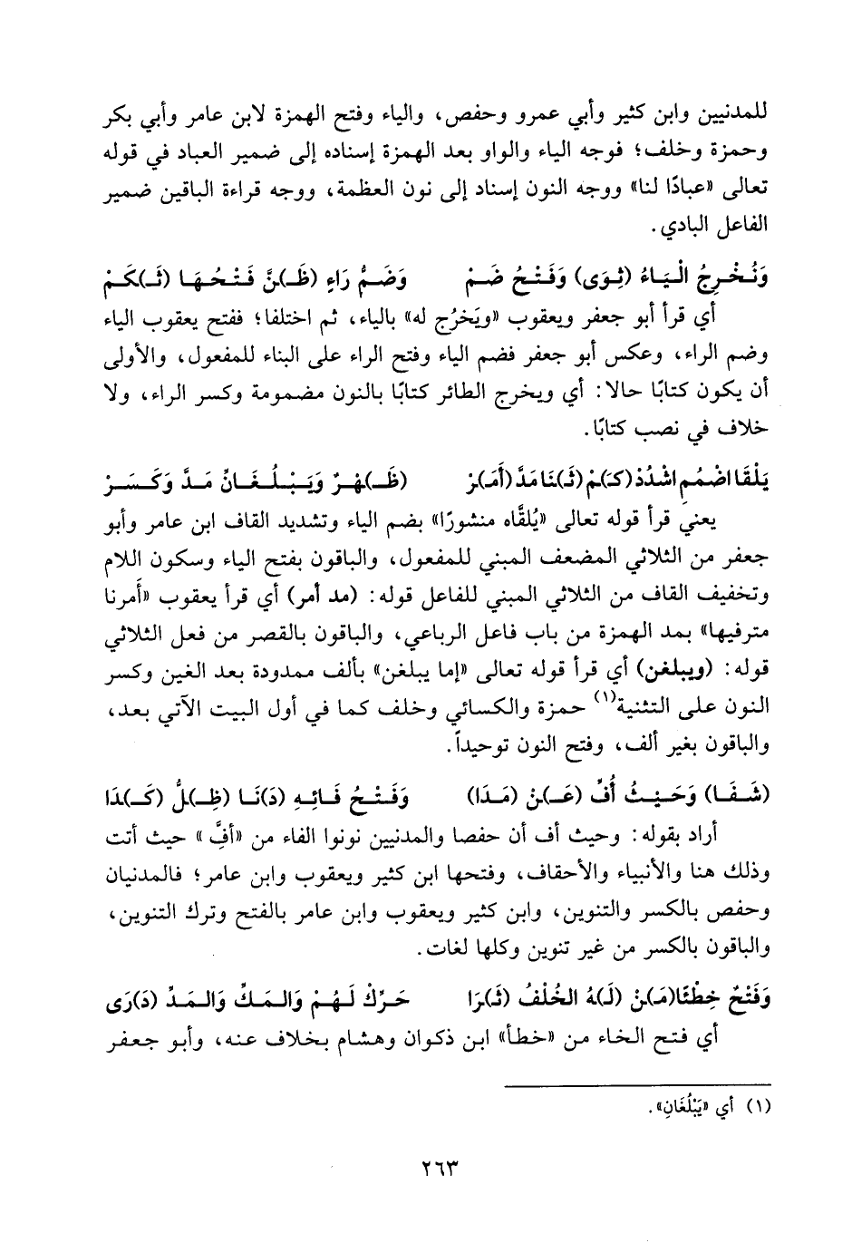 يعني قرأ قوله تعالى «يلقّاه منشورا» بضم الياء وتشديد القاف ابن عامر وأبو جعفر من الثلاثي المضعف المبني للمفعول، والباقون بفتح الياء وسكون اللام وتخفيف القاف من الثلاثي المبني للفاعل قوله: (مد أمر) أي قرأ يعقوب «أمرنا مترفيها» بمد الهمزة من باب فاعل الرباعي، والباقون بالقصر من فعل الثلاثي قوله: (ويبلغن) أي قرأ قوله تعالى «إما يبلغن» بألف ممدودة بعد الغين وكسر النون على التثنية (¬1) حمزة والكسائي وخلف كما في أول البيت الآتي بعد، والباقون بغير ألف، وفتح النون توحيدا.